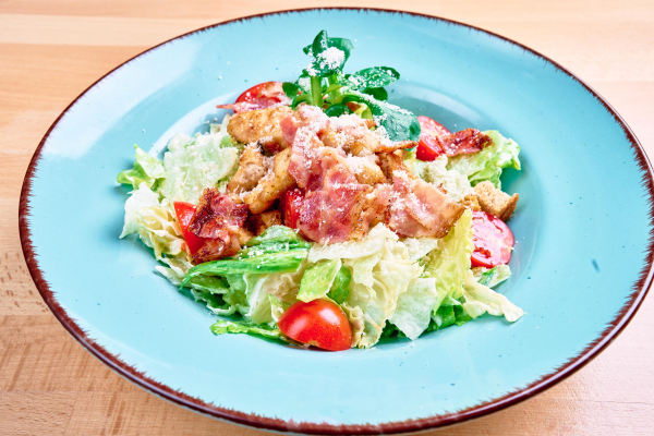 100g grilované kuracie prsia, miešané listové šaláty, slaninové chipsy, cherry paradajky, krutóny, domáci caesar dressing, parmezán