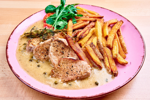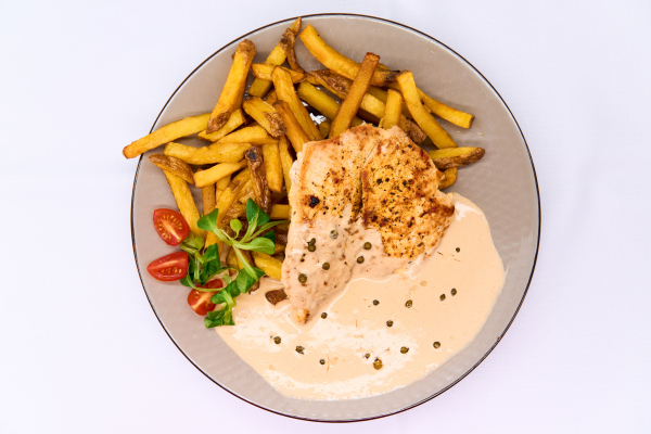 Kurací grilovaný steak na omáčke zo zeleného korenia s domácimi hranolkami