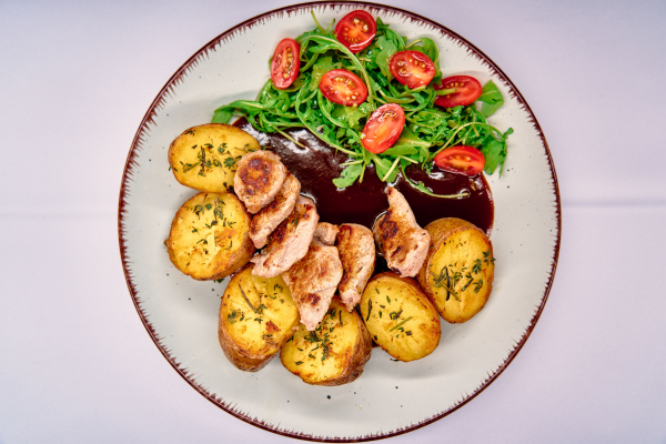 podávaná s pečeným zemiakom v šupke, šampiňónovým ragú a cherry paradajkami