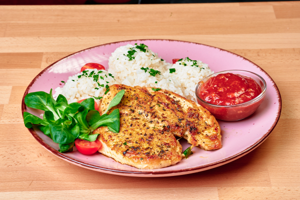 kuracie prsia dochutené našimi koreninami, podávané s ryžou, polníček