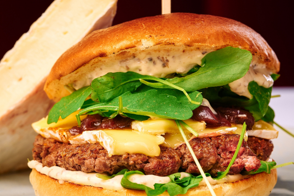 150g kuracie mleté prsia, maslová žemľa, ľadový šalát, chedar, volské oko, slaninové chipsy, slaninová majonéza, karamelizovaná cibuľa, rukola