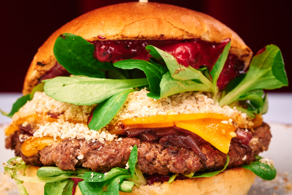 150g hovädzie mleté mäso (Košecký dvor), maslová žemľa, čučoriedková majonéza, orechový prach, polníček, 2x chedar