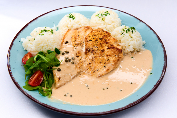 Kurací grilovaný steak na omáčke zo zeleného korenia s ryžou