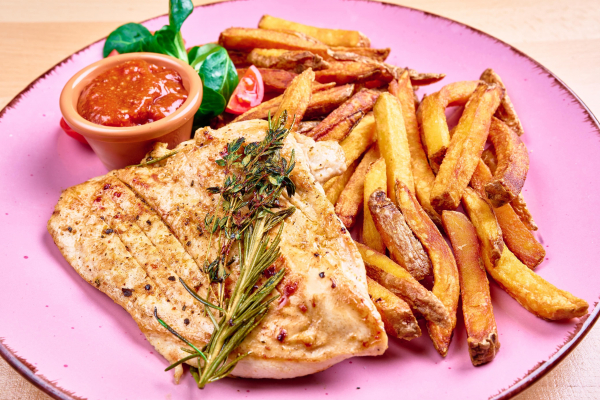 kuracie prsia dochutené našimi koreninami, podávané s domácimi hranolkami, polníček