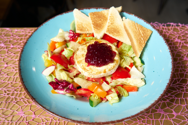 100g grilovaný encián, zmes listových šalátov, cherry paradajky, granátové jablko, karamelizované vlašské orechy, uhorka, čučoriedková majonéza, hrianka